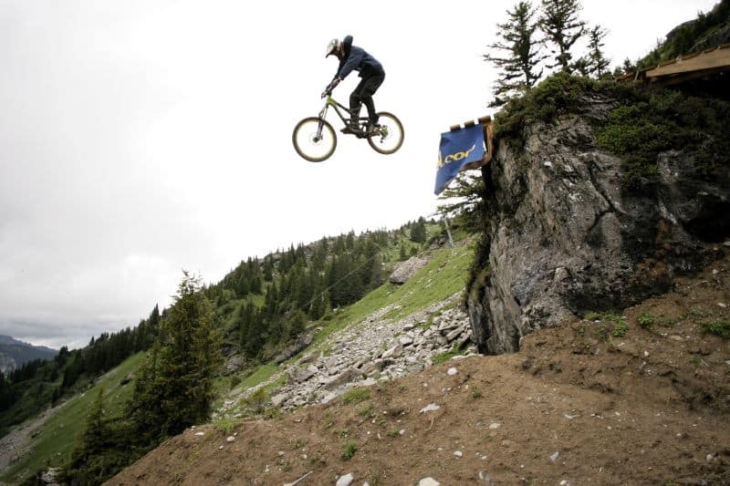 La pluie continue de ces derniers jours et la pratique du slopestyle de montagne, ici au Mountain Park de Chatel, n’ont pas spécialement motivé les riders à s’aventurer sur les modules du parcours. Pourtant, le site est absolument somptueux, le plus impressionnant jamais vu en France selon l’avis de certains experts et des deux riders présents en gros.